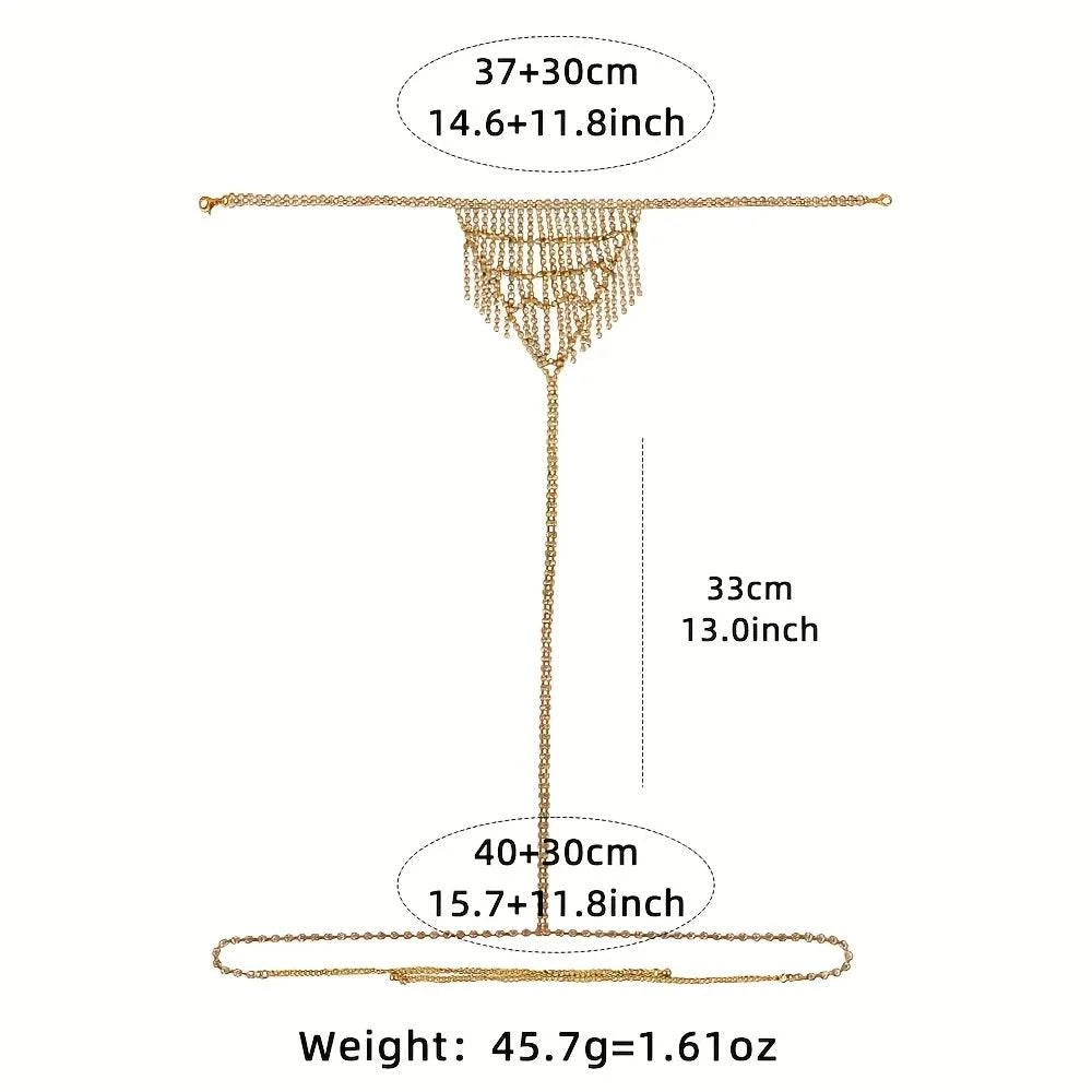 Dale un toque de elegancia y brillo a tu atuendo con la cadena de cintura con borlas y diamantes de imitación. Esta joya corporal se adapta a la cintura o las caderas, capturando la luz con brillantes diamantes de imitación y delicadas borlas. Ya sea para una salida nocturna, para un club o para lucir lencería, es un accesorio que realza cualquier look con glamour y un toque vanguardista.